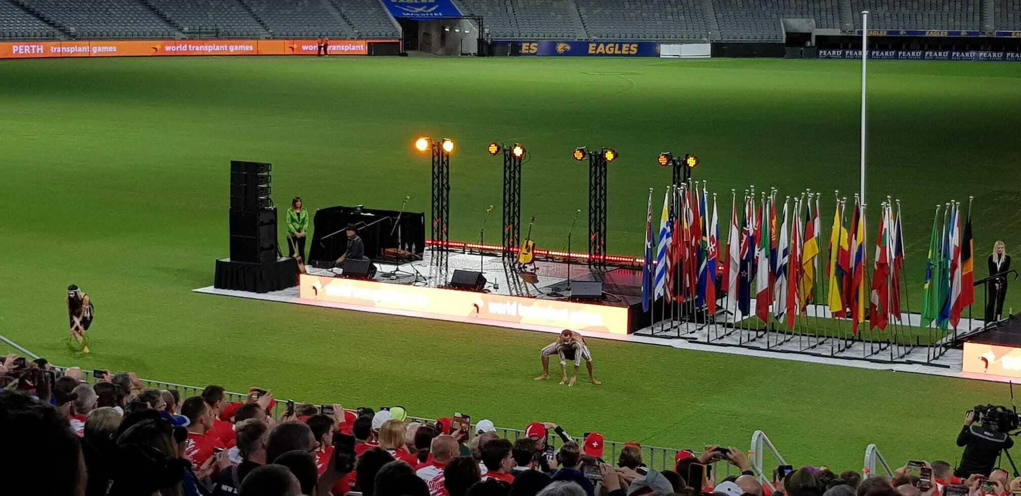 Mit der Eröffnungsfeiereier im Opus Stadion in Perth wurden die 24. World Transplant Games 2023 in Perth feierlich eröffnet. Die Eröffnungsfeier startete mit der Parade der Nationen der über 1500 Athletinnen und Athleten aus 45 Nation über die neu errichteten Matagarup Bridge.
